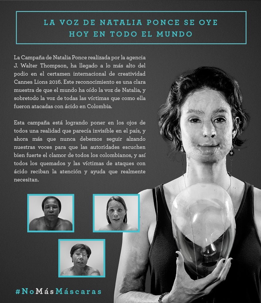 Por medio de la Campaña, en el año 2016 Natalia Ponce de León emprendió una dura estrategia de pedagogía, socialización y educación en Colombia en contra de los ataques con agentes químicos. La idea central, giraba en torno en visibilizar un problema de orden nacional del cual poco se hablaba, pero que año tras año dejaba una enorme cantidad de víctimas a quienes se les vulneraron sus derechos en temas de salud, y acceso a justicia.